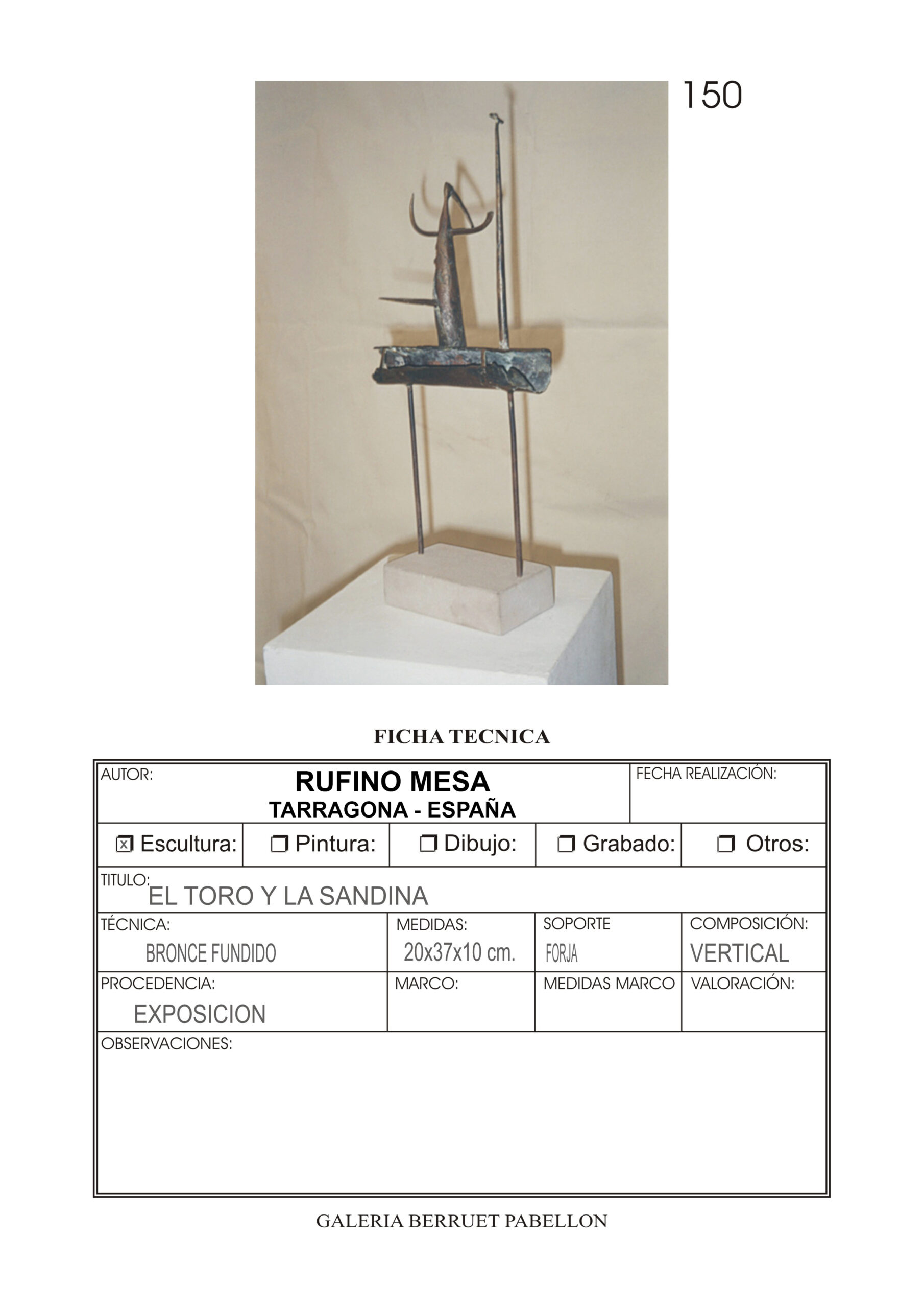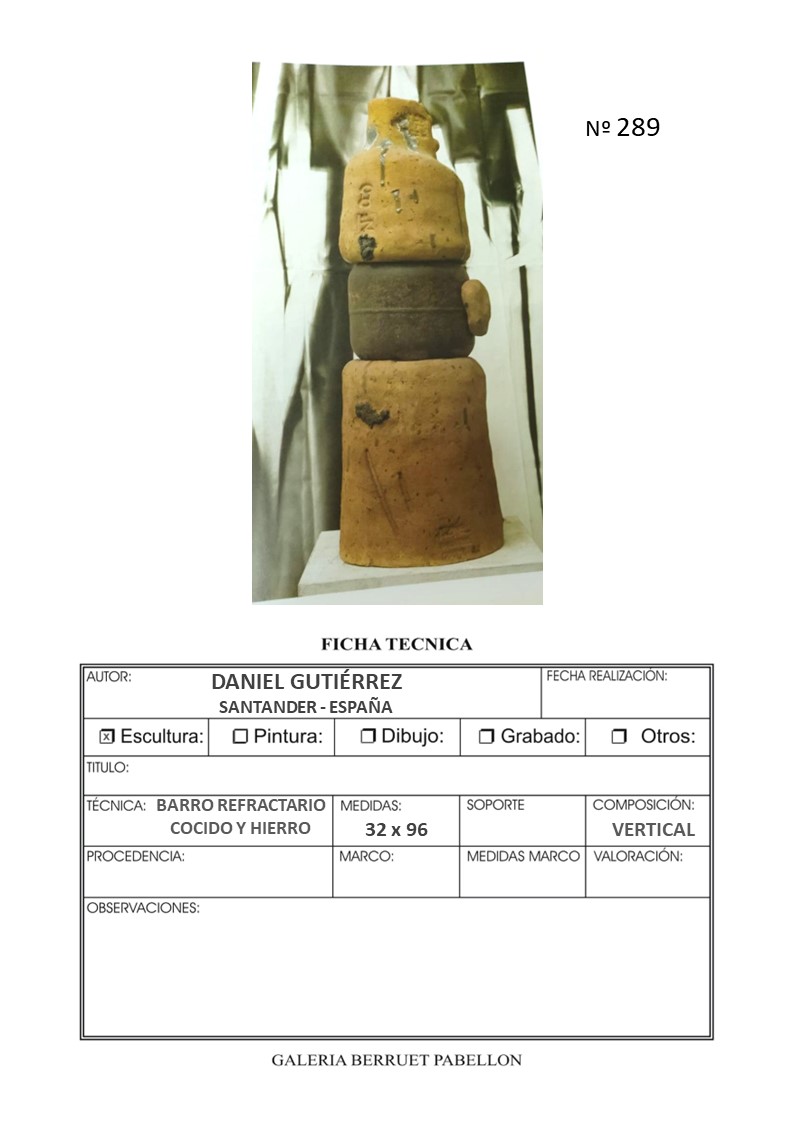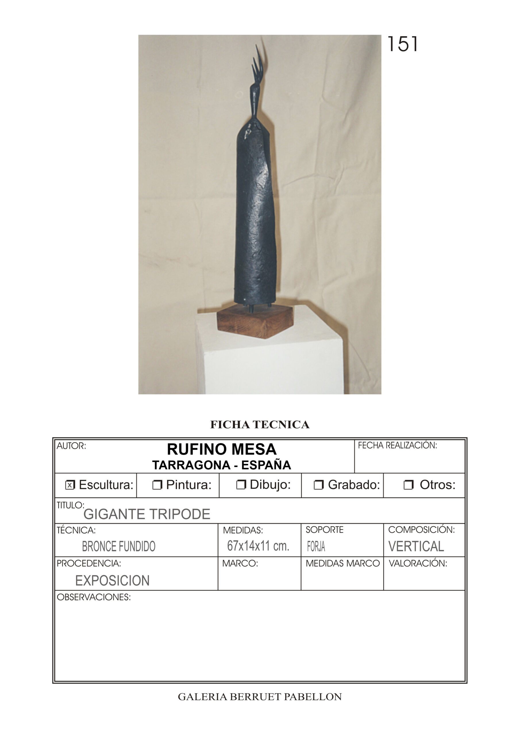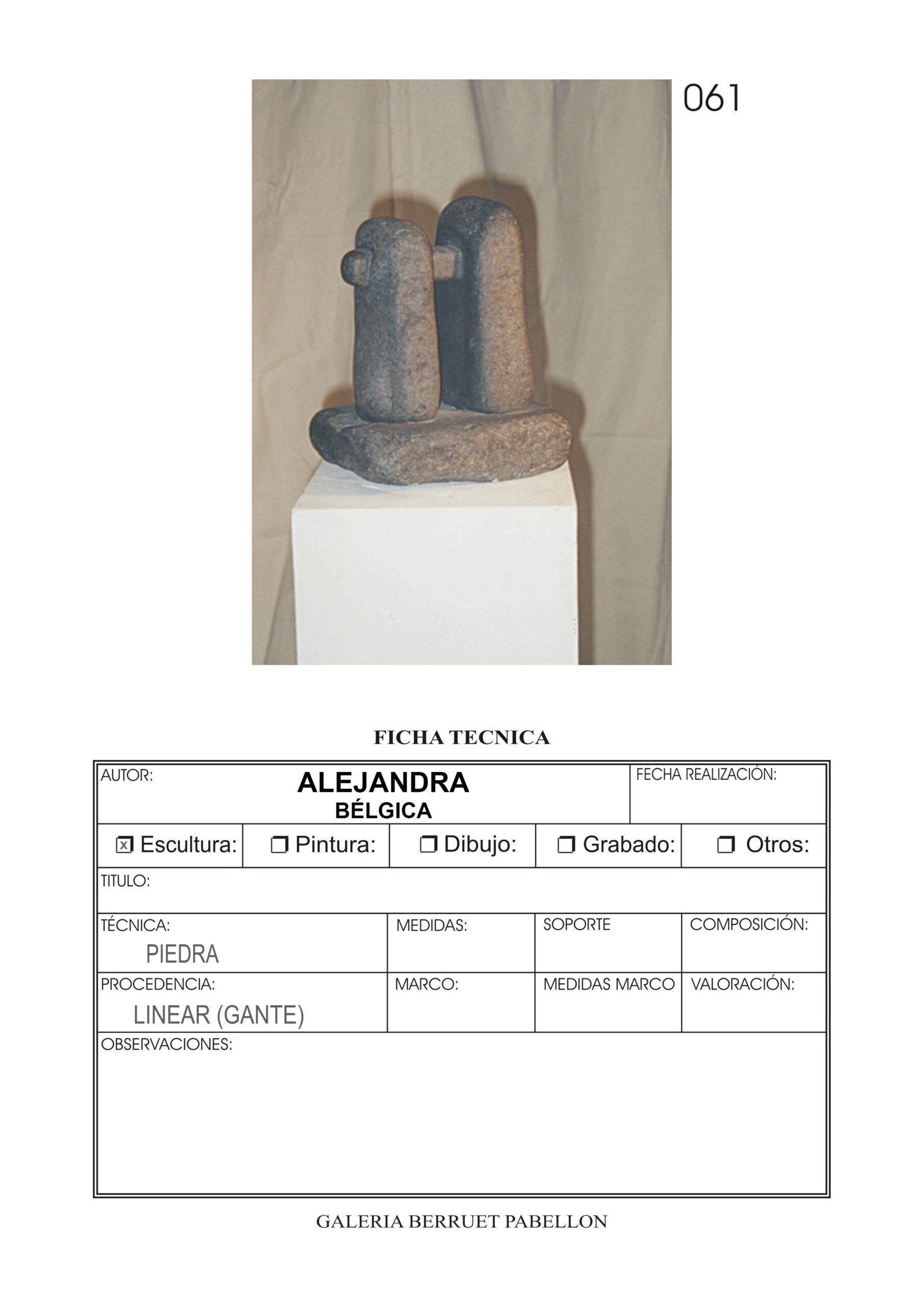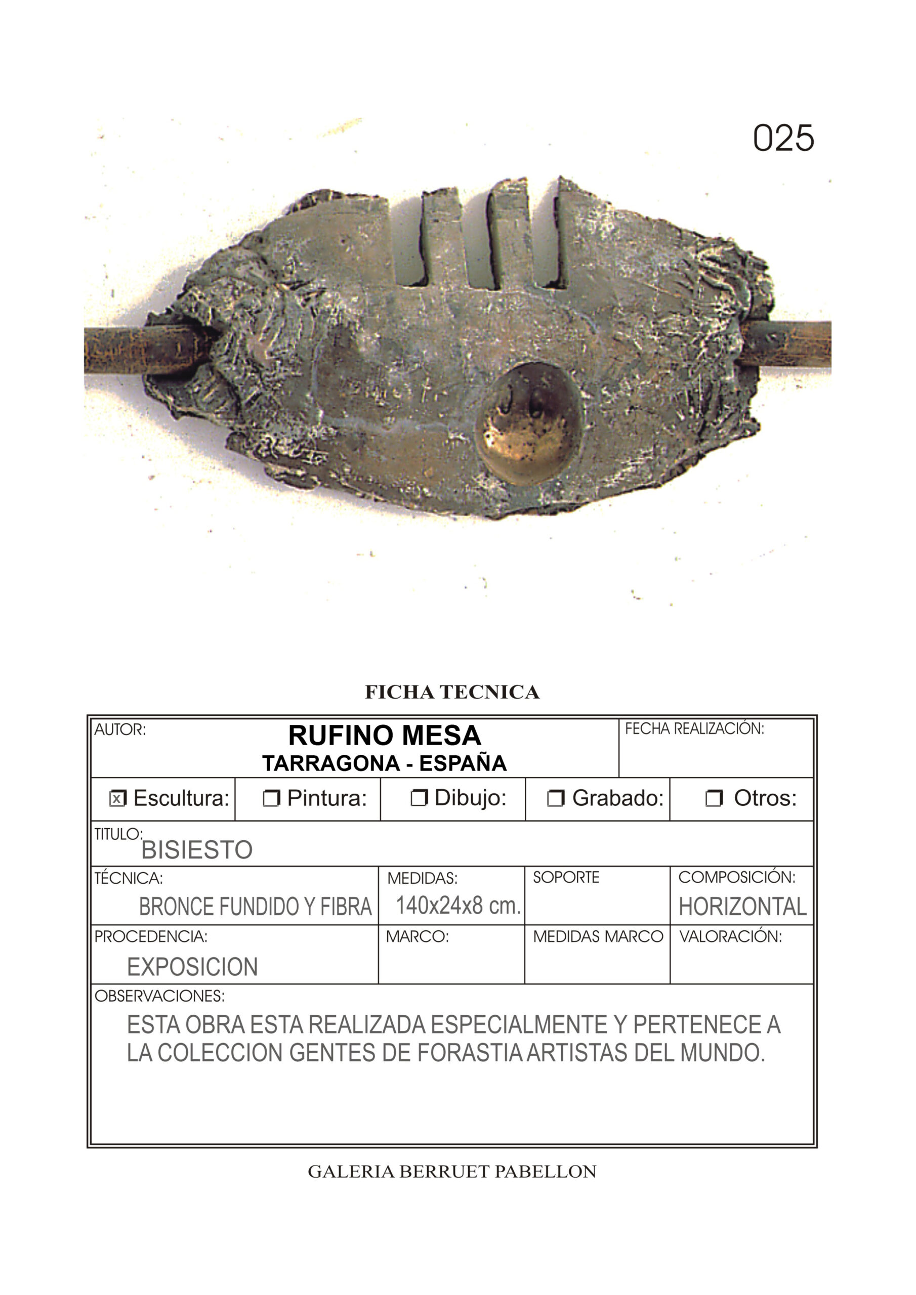 A continuación le mostramos la totalidad de las esculturas de la galería. Por favor, si se encuentra interesado en una de ellas o en varias, comuníquese con nosotros a través del apartado de contacto, indicando el número de cada ficha para poder ofrecerle un servicio más dinámico.